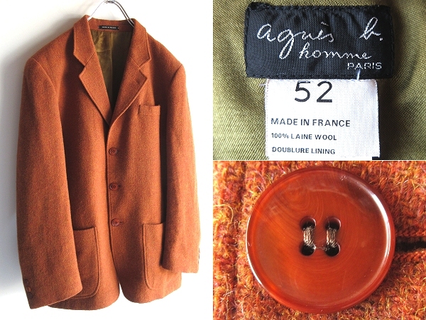 - 希少 フランス製 ビンテージ agnes b. homme アニエスベーオム ウールツイード 3Bテーラードジャケット ブレザー 52 ブラウンオレンジ