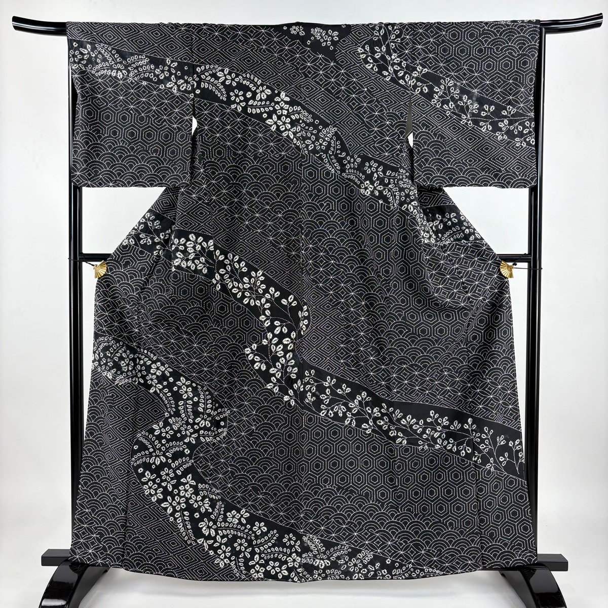 - 【在庫一掃】 訪問着 身丈162cm 裄丈66.5cm M 袷 紬地 草花 有職文様 絞り 刺子刺繍 墨色 正絹 美品 逸品 【中古】