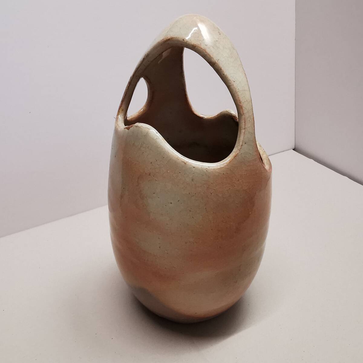 - ★【緑栄 銘】手付 花器 一輪挿し/貫入釉 灰被り風/口縁剥がれ有・経年品◆高さ19cm 和モダン インテリア ドライフラワー