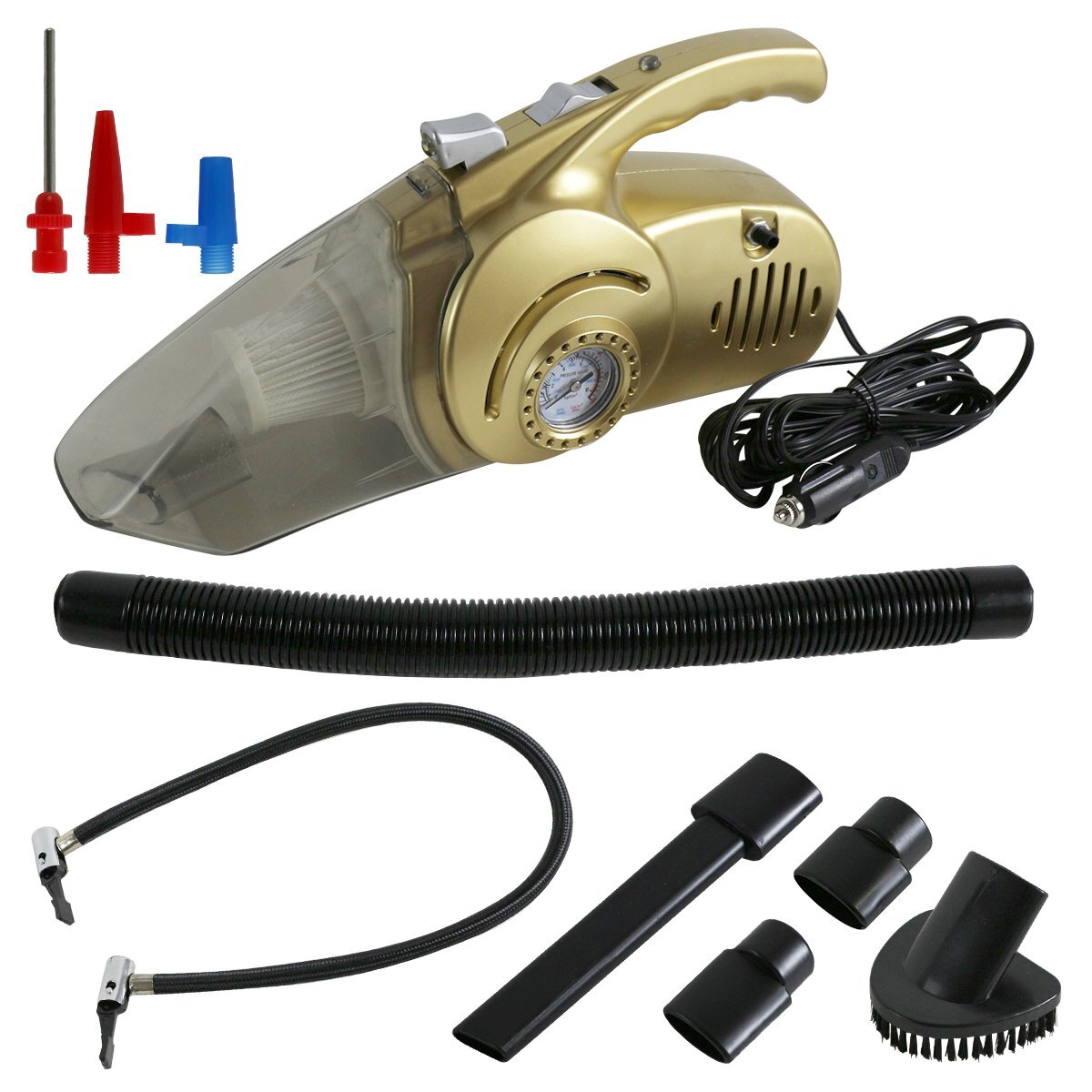 - 車用 掃除機 シガーソケット 給電 12V 強力吸引 120W 浮き輪 空気入れ LED 照明 エアゲージ メーター付 キャンプ 車中泊