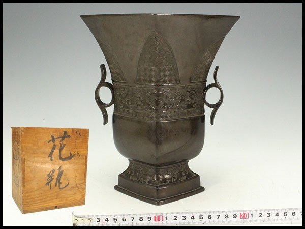 - 【金閣】茶道具 花道 古銅 饕餮紋 菱口 瓶 高23.5cm 時代物 旧家蔵出 送料無料(YC390)