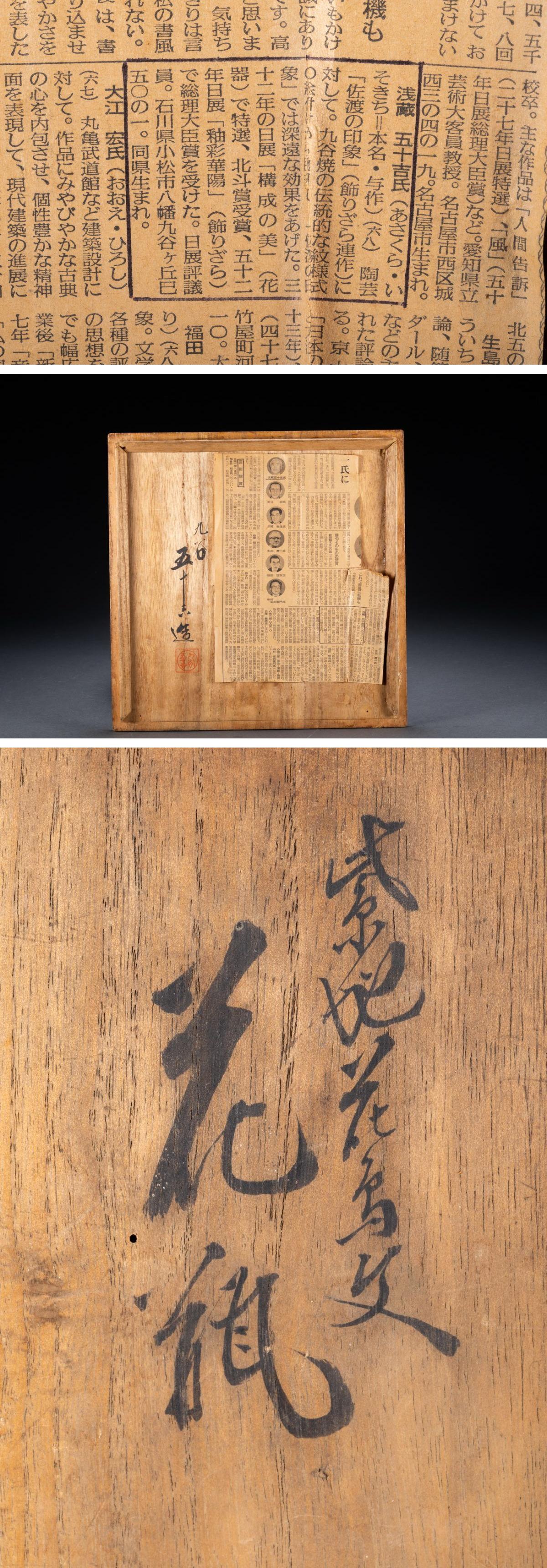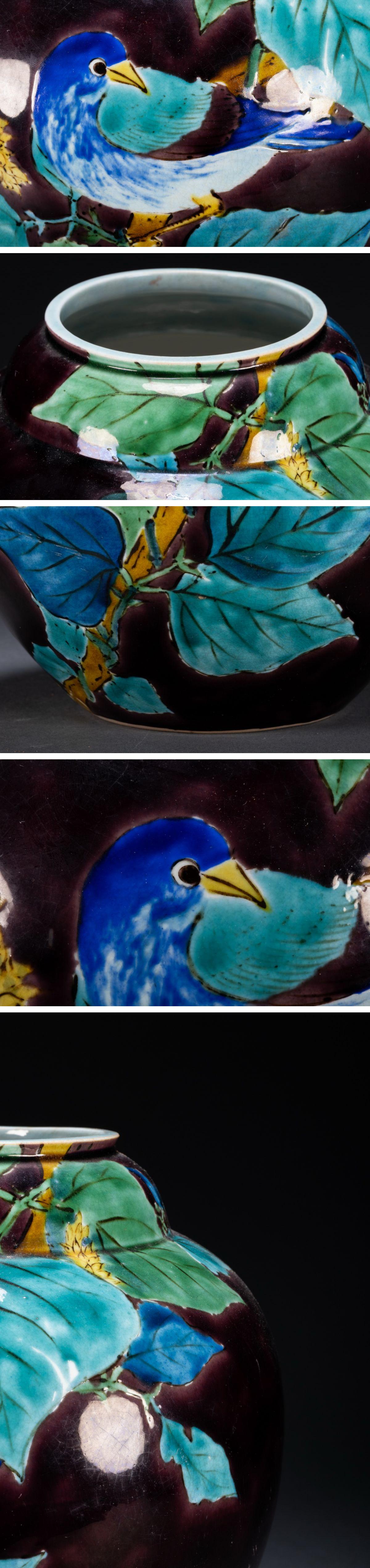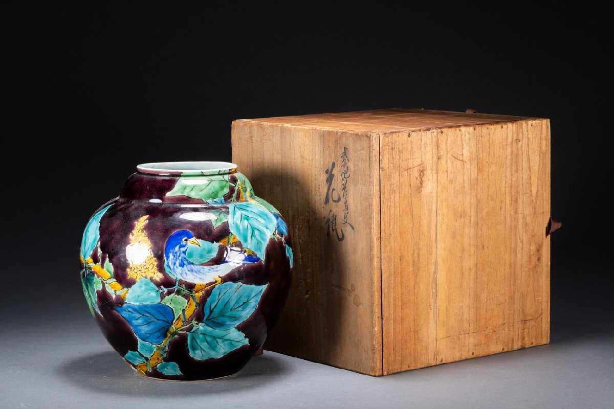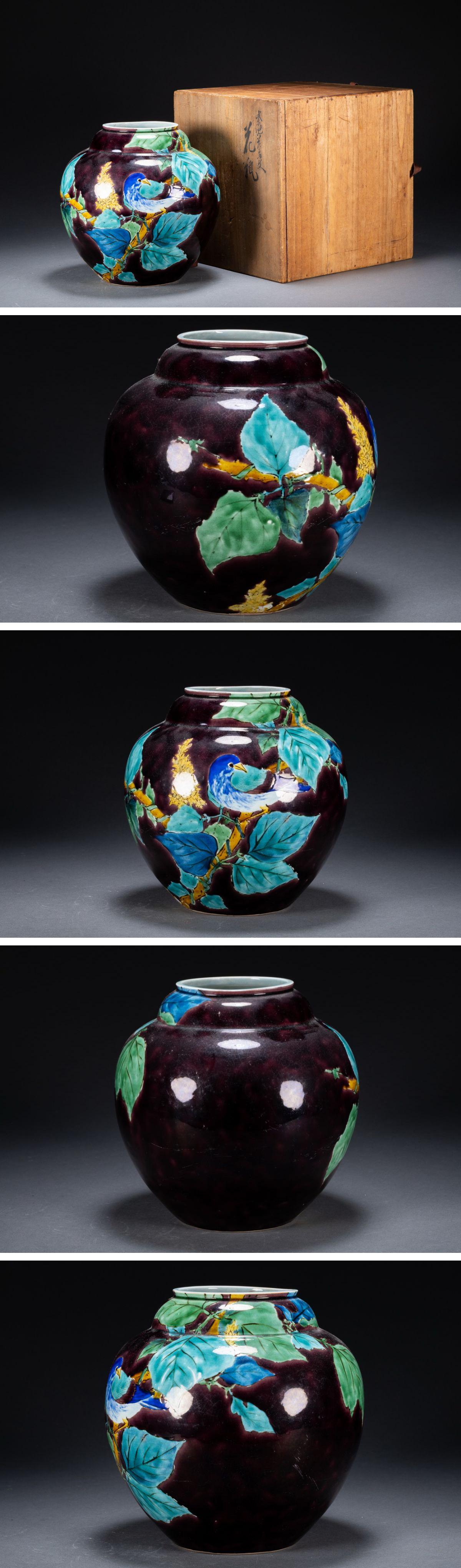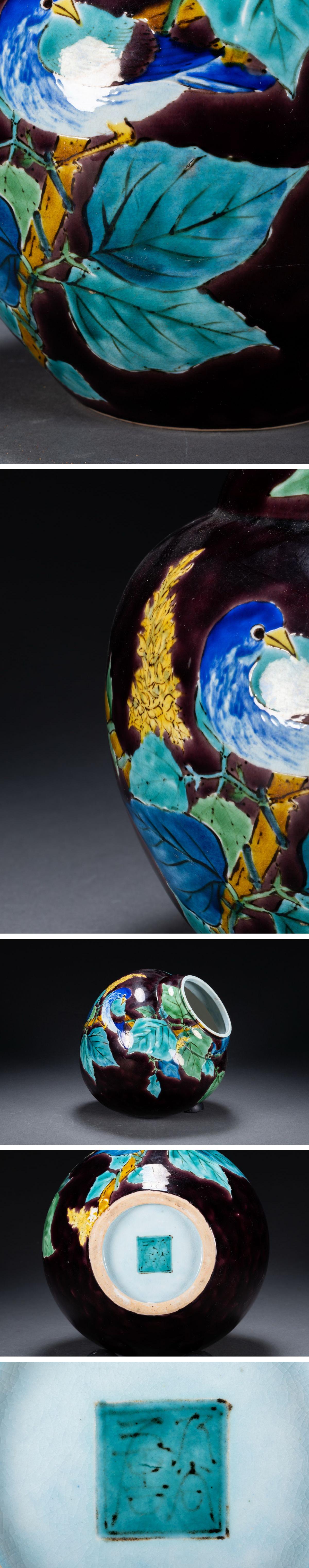 > 【雲錦】某有名オークション購入 時代物 九谷焼「浅藏五十吉」造 紫地花鳥文花瓶 古置物 古擺件 古美術 時代コレクション7L10-60S1