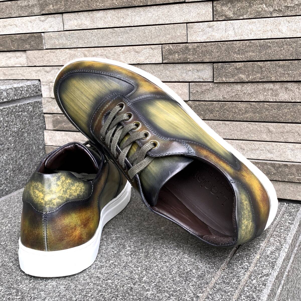 - 【エル エクレ】メンズ パティーヌ本革レザー スニーカー グリーンカーキ緑 限定 シューズ 長財布 yuhaku