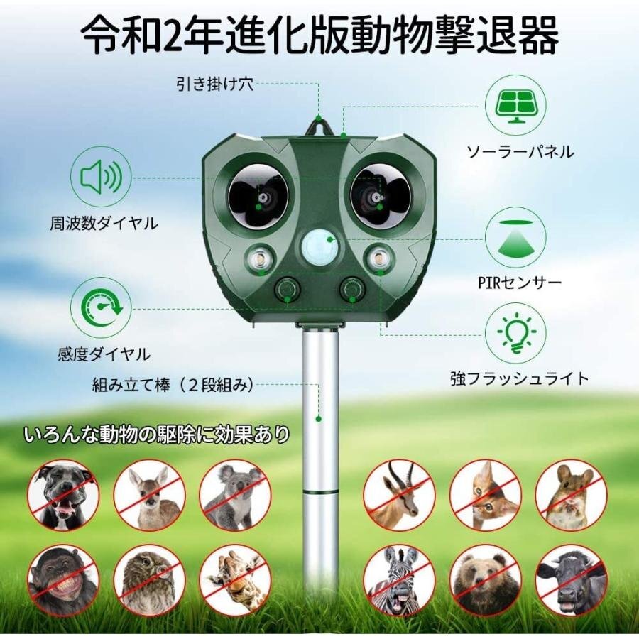 - 猫よけ 動物撃退器 動物よけ 害獣撃退 超音波 ソーラー充電 カラス猫除け 猫撃退 猫退治 モグラ退治 鳥害対策 鳥除け 犬除け 防水防