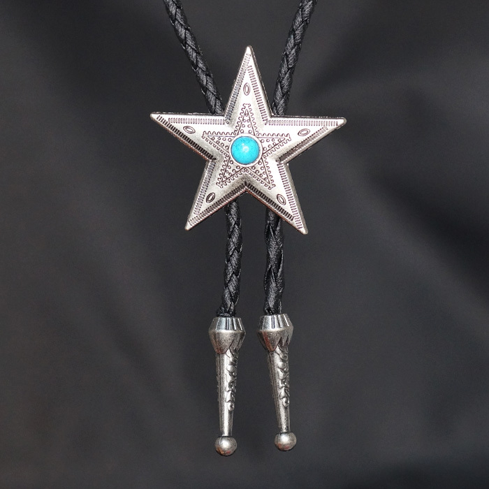 - [Fashion] Bolo Tie ターコイズ ブルー ストーン カウボーイ スター星 バックル ループタイ 紐ネクタイ レザーロープ ボロ タイ (シルバー)