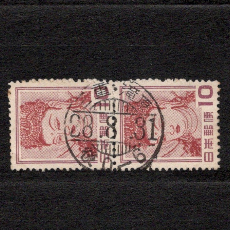 > 使用済 2次動植物国宝切手 10円 観音菩薩像 ペア 櫛型印 三重・滝原 28.8.31 後0-6