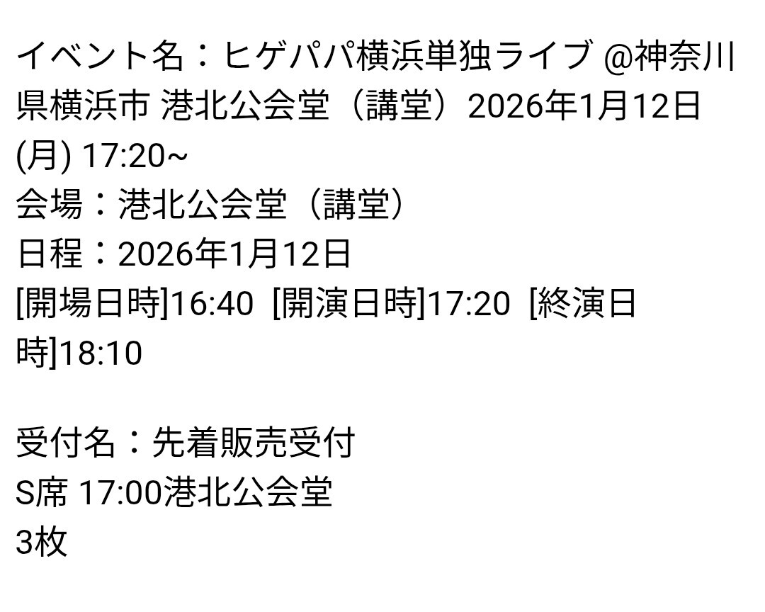 - ひげパパ 横浜 ライブ 1月12日 S席3名分 17時20分開演