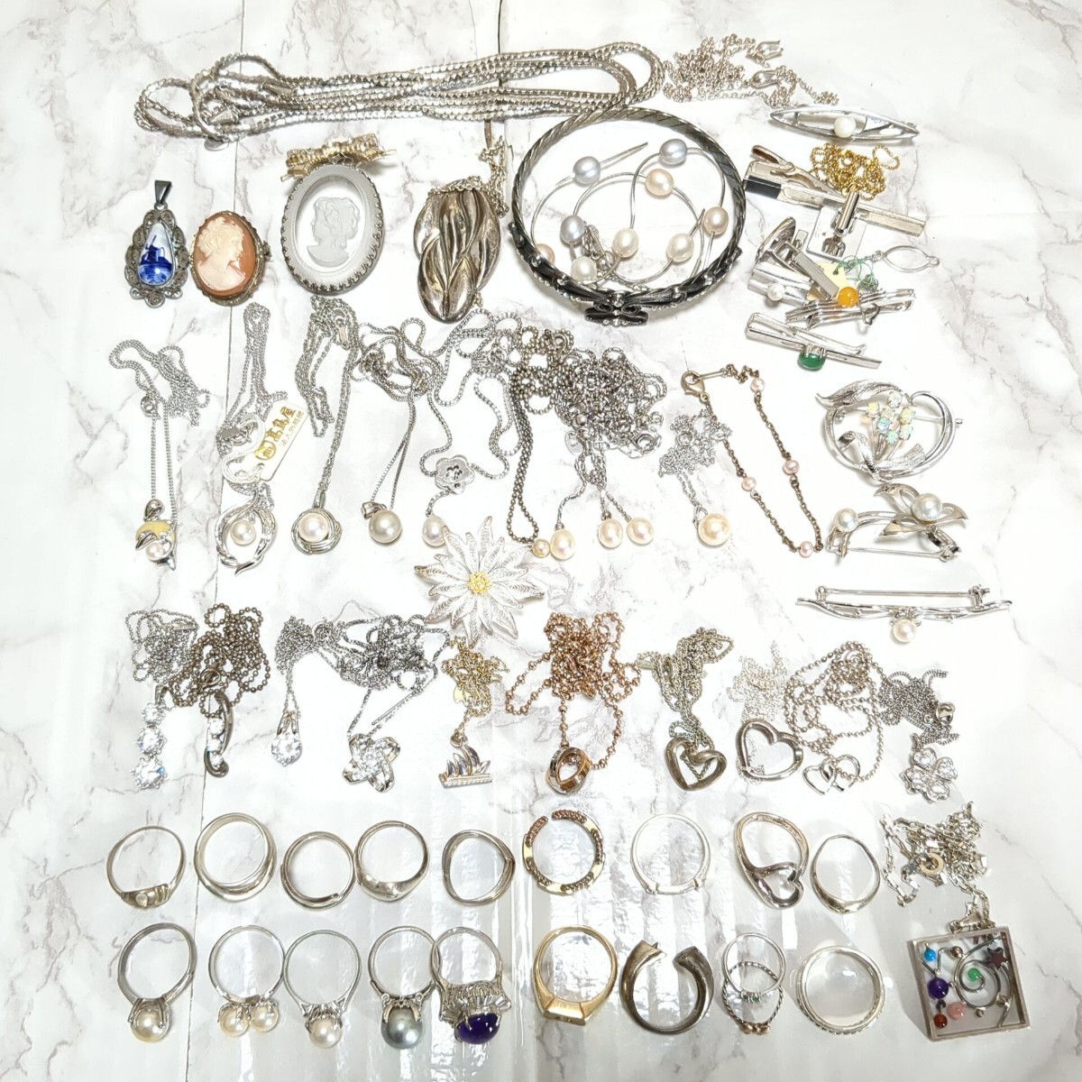 - 325g シルバー silver 925刻印等 銀製品 ネックレス リング 色石 パール 真珠 カメオ アクセサリー ブローチ ミキモト含 まとめ 大量 1円
