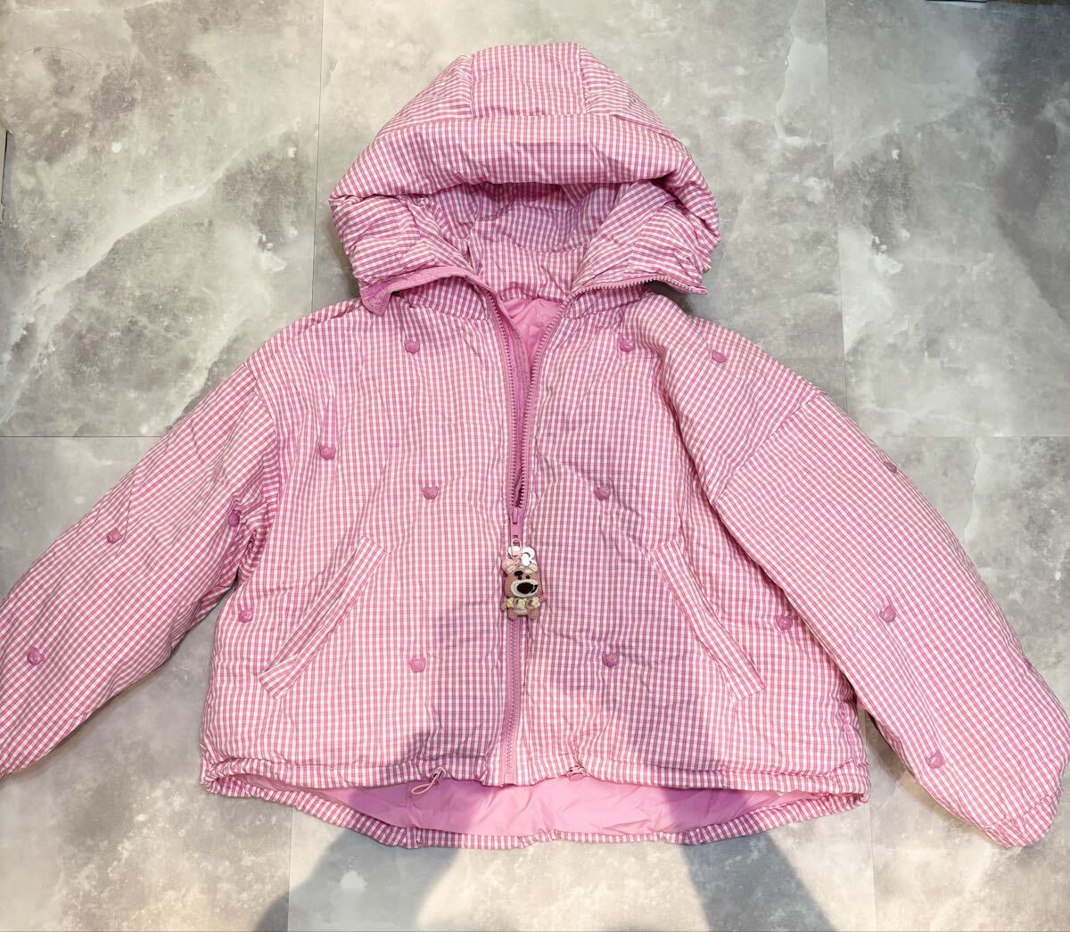 - 熊ボタンピンク チェック柄 ダウンジャケット フード付きフリーサイズ