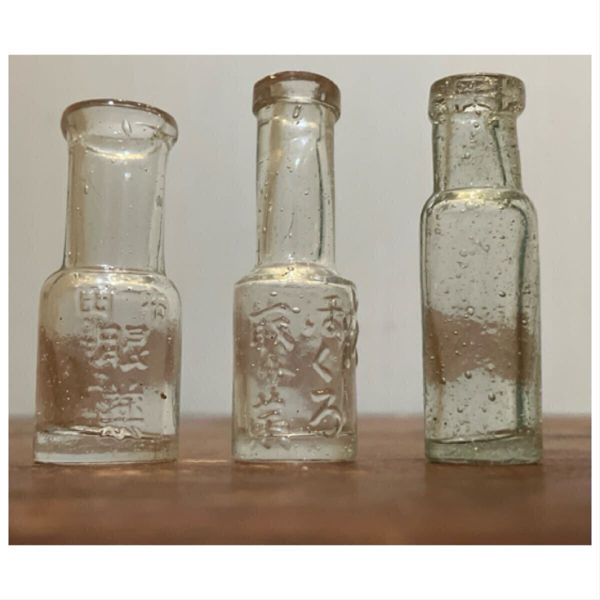 - M-4 小さなエンボス入りのイボ・ホクロ取り薬瓶など3本セット(レトロガラス 和硝子 和ガラス 古ガラス レトロ瓶 おはじき ビー玉 古道具)