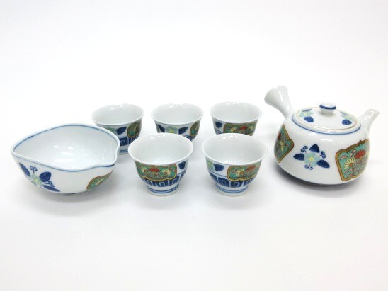 > 【11-170】栄山 青華色絵花文 茶器揃 急須 湯呑 茶碗 湯冷まし 煎茶碗 茶道具 茶器 陶器 青緑 長期保管品