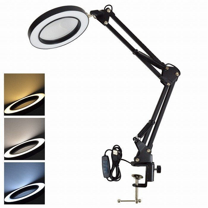 - 【送料無料】LEDライト付き 卓上 拡大鏡 5倍 ルーペ 360°回転 アーム グリップ USB電源 スタンドルーペ 手芸 作業 読書