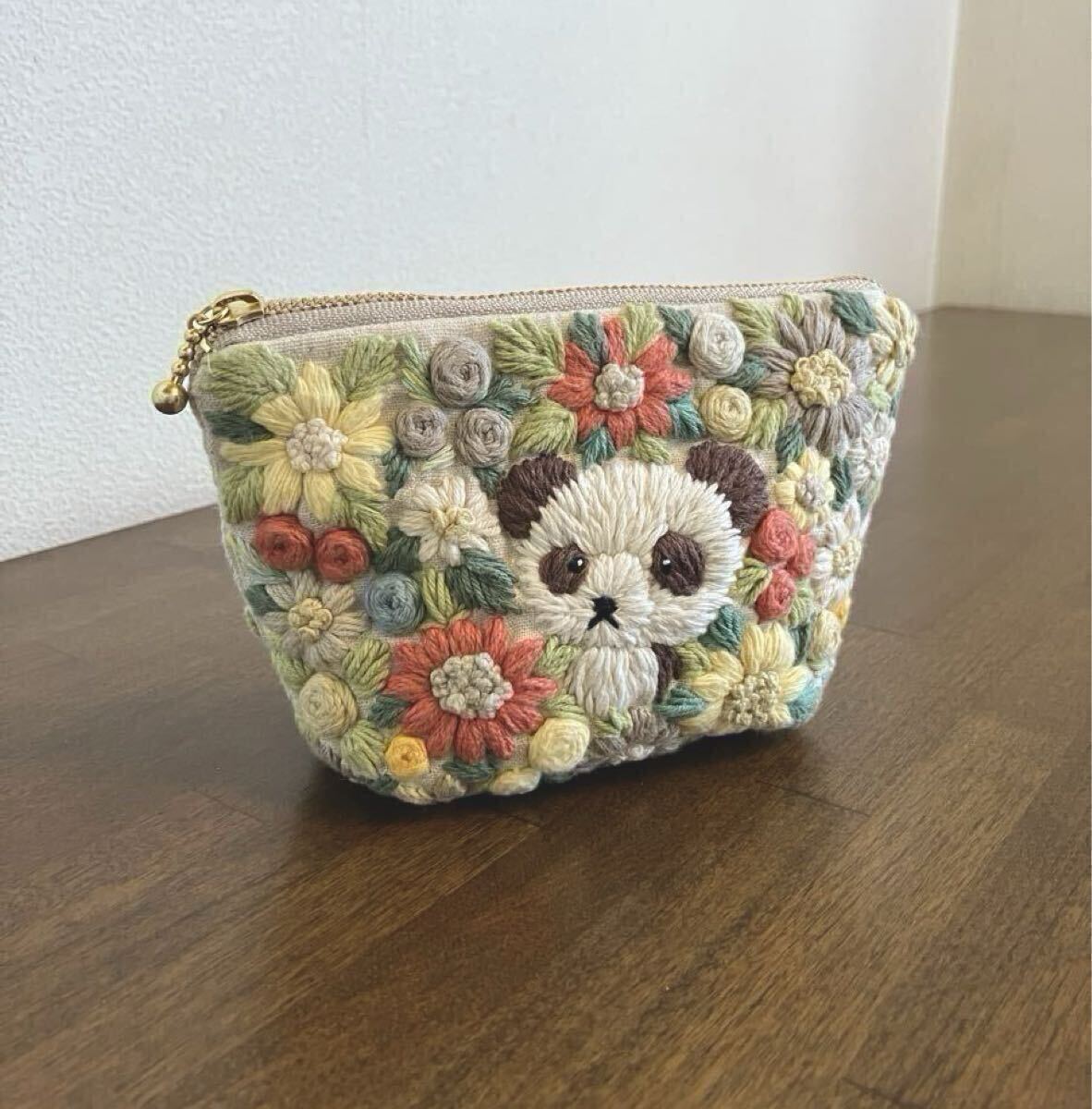 - 手刺繍 パンダとお花のミニポーチ 小物入れ 化粧ポーチ ハンドメイド 16cmファスナー