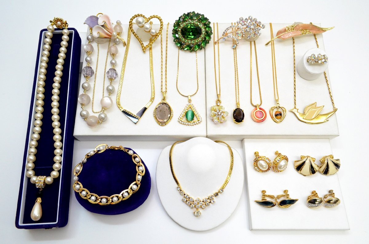 > 豪華 アクセサリー まとめ ネックレス ブローチ 指輪 イヤリング ブレスレット 他 ゴールドカラー 色石調 ヴィンテージ調 刻印含む [fui]