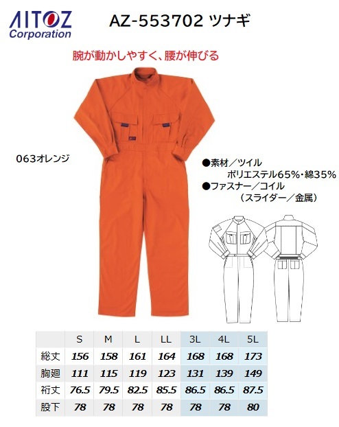 - [超特価]◎アイトス 長袖ツナギ 553702【063オレンジ・Mサイズ】腕が動かしやすい・腰がのびる品、即決1980円