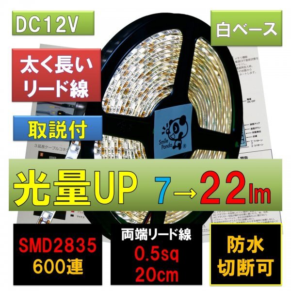 - 高輝度ピカット LEDテープライト 12V 防水 5m 電球色 白ベース SMD2835 22lm 600連 太くて長い両端配線 0.5sq 20cm fa