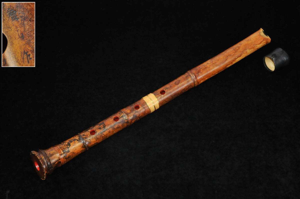 - 【尺八】 在銘 善村鹿山 『中継ぎ 籐巻金装飾 都山流歌口 斑点模様』 全長:約55㎝ 和楽器 管楽器 03260303-3