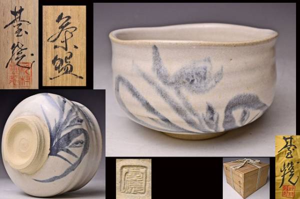 - 臺焼 ( うてな焼 ) ★ 藁灰染付草文茶碗 ★ 共箱共布栞 ★ 検 お国焼 台焼