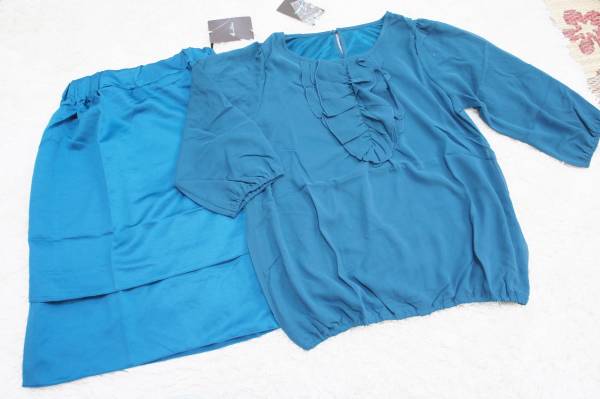 - ゆったり胸フリルシフォンブラウス+光沢スカート:上下*緑 M