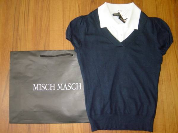 - 新品ミッシュマッシュ◆パフスリーブ&襟スキッパー半袖ニット紺◆MISCH MASCH