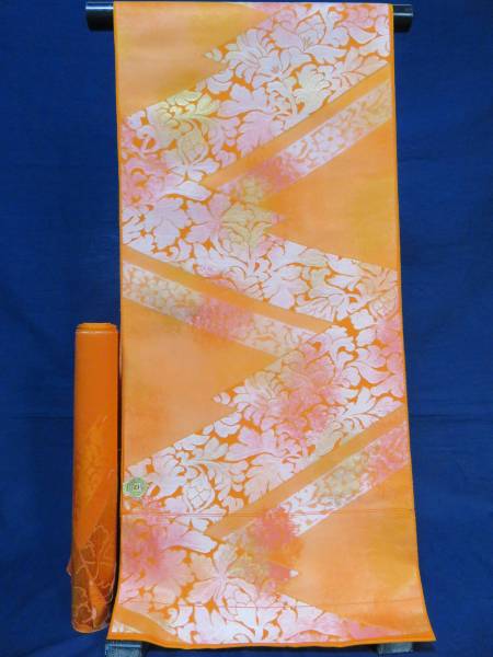> 【桐輪】九寸帯☆送料無料*唐花文様*未仕立品*美品{正絹☆九寸名古屋帯}*黄赤色地*引箔.暈し織地*多色箔.暈し織の唐花*六通柄*№3452211