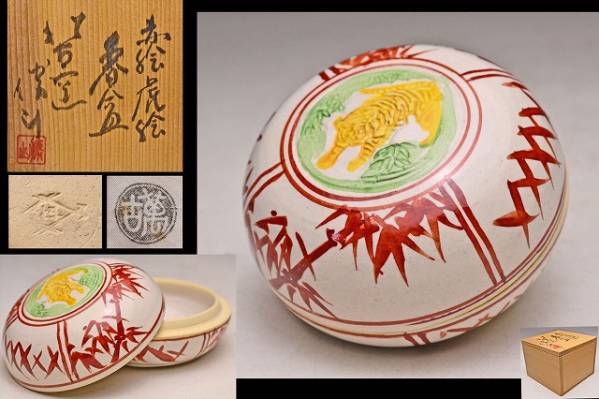 - 佐久間勝山 ★ 赤絵虎絵香合 ★ 共箱共布 ★ 松阪萬古焼 ★ 検 佐久間芳丘