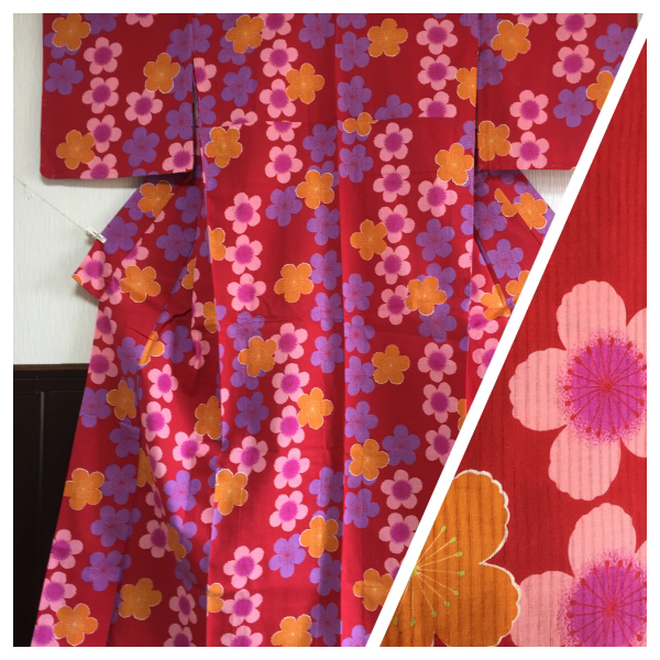 - 【浴衣】綿 身丈164cm 紅色ベースに三色の桜 躾有YUKI TORII