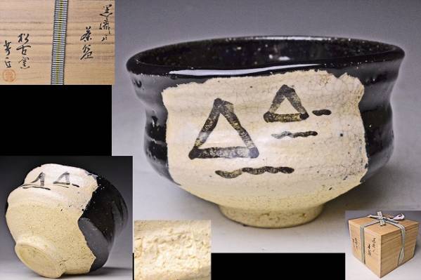 - 佐久間芳丘 ★ 黒織部茶碗 ★ 共箱 ★ 萬古焼 ★ 検 佐久間勝山 佐久間芳隣
