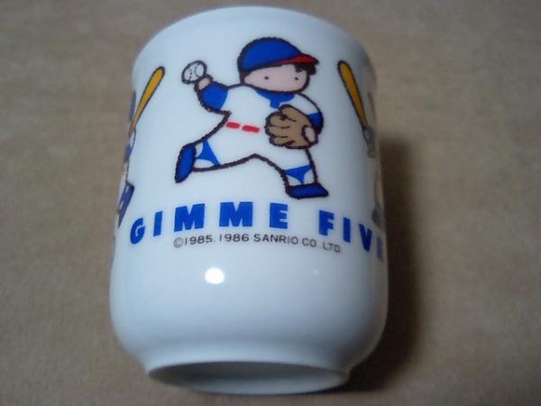 > 激レア ギミーファイブ 陶器 長湯のみ サンリオ 日本製 1986 かわいい 野球 ブルー ホワイト 少年 昭和 レトロ 雑貨 貴重 ポイント消化