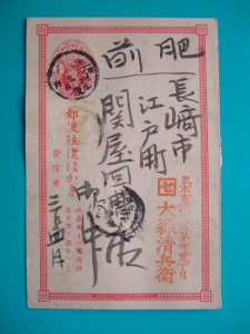 - 小判はがき局銘 往復往信赤 東京市浅草区茅町 肥前国 長崎 エンタイヤ葉書