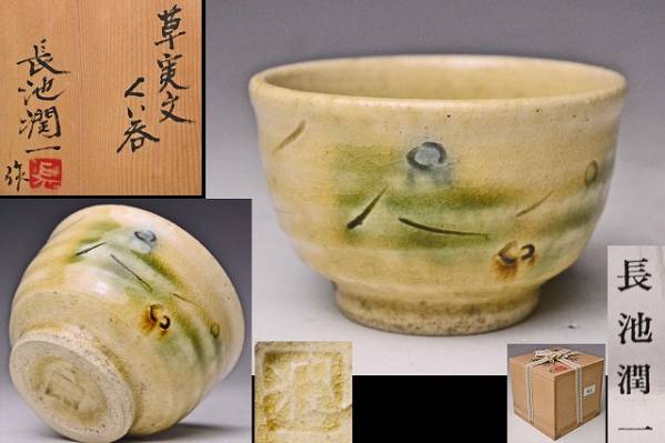 - 長池潤一 ★ 黄瀬戸釉草実紋ぐい呑 ★ 共箱栞 ★ 師: 人間国宝 藤本能道 ★