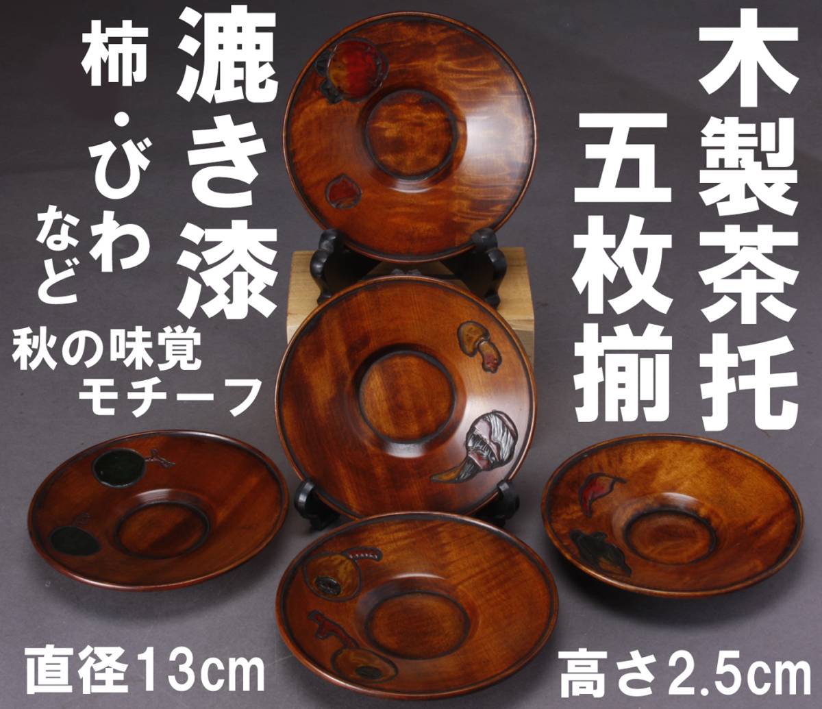 - 木製 茶托5枚組 透き漆 秋の実 直径13cm 高さ2.5cm 中古 KA-6707