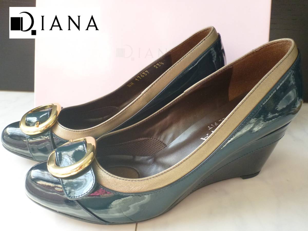 - 1.5万DIANA ダイアナ 緑グリーン×ゴールド エナメル オープントゥパンプス パンプス 23.5