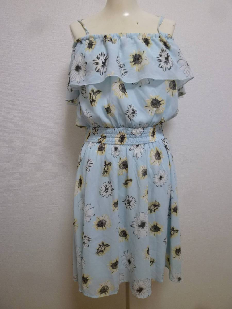 - Newlyme♪水色デイジーひまわり柄フリル襟ワンピースL/フレアー花柄膝丈♪131