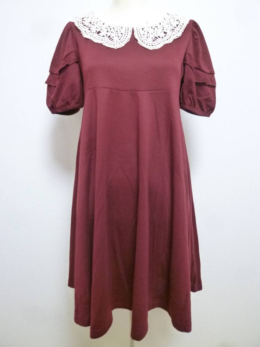 - earthmusic&ecology/アースミュージック&エコロジー♪ワイン色かぎ編みレース襟パフスリーブフリルフレアーワンピースF/ボリューム袖♪215