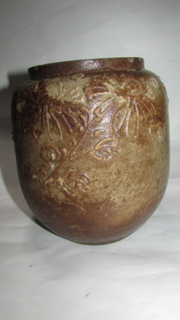 - (旧家・蔵出し)(古大堀相馬焼・白釉薬イッチン菊に蝶模様壺)貴重・珍品
