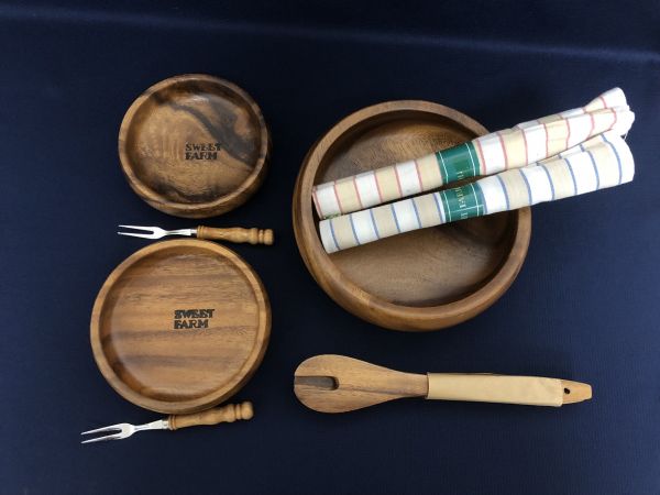 - 未使用品★SWEET FARM 木製食器 大皿1枚 小皿2枚 フォーク2本 マット2枚 とりわけ用スプーンフォーク 箱あり管理1803 X-3