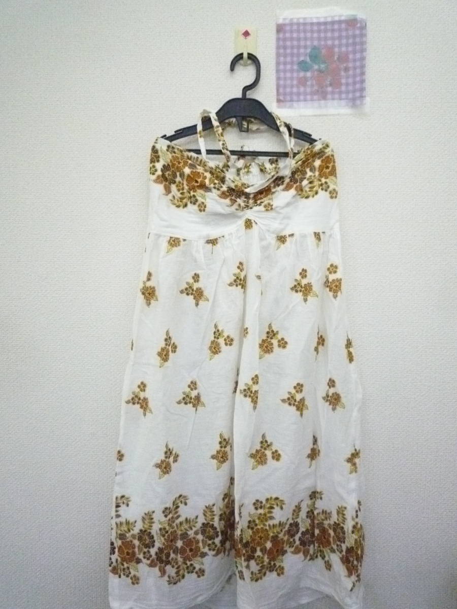 - ★KRISNABATIK ホルダーネックキャミソールワンピース ひざ下丈 白×茶系 ラメお花柄