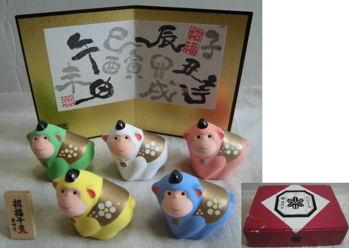 - 干支置物 申 色違い 5体 薬師窯 箱入り 土人形 陶人形 招福 開運 猿 さる 飾り物