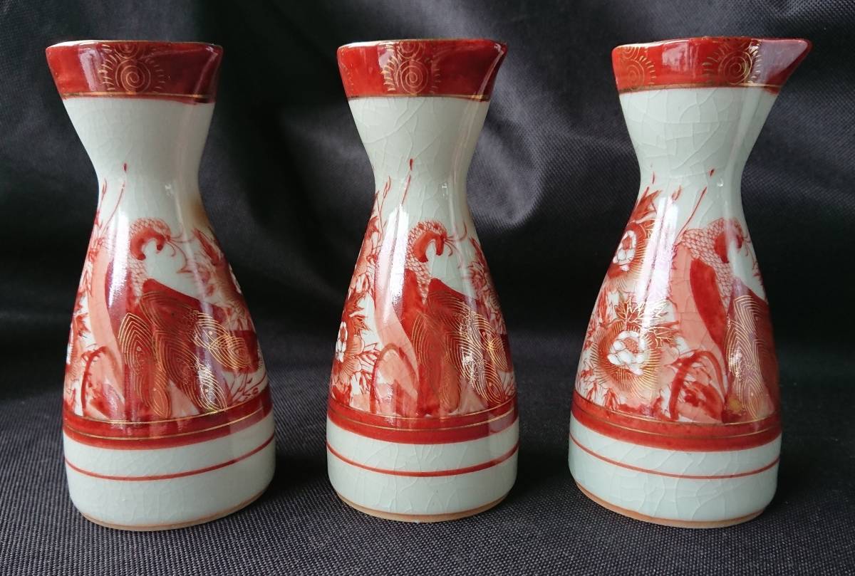 - アンティーク 昭和 レトロ 高級 九谷 とっくり 徳利 孔雀 3本 酒器 W-2539