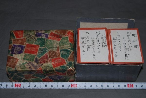 - q1794】昭和レトロ 百人一首標準かるた 読み札-100枚 箱(古い使用済み 切手) 昭和4年 東京市京橋區 新橋堂