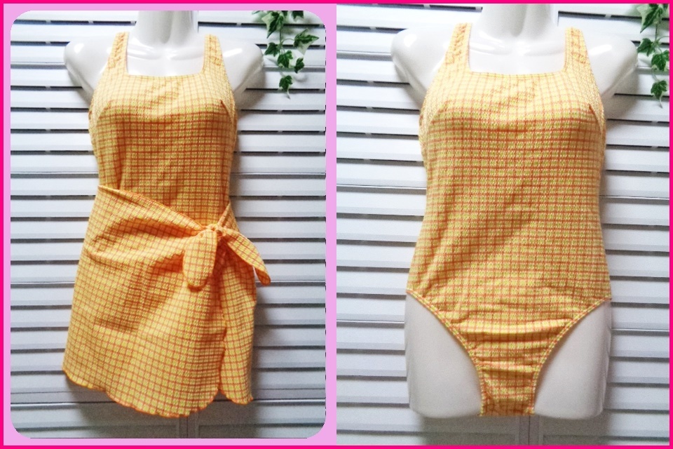 - RIOKA 日本製 バックレースアップ ワンピース水着 パレオセット 11号/L イエロー×オレンジチェック サッカー生地
