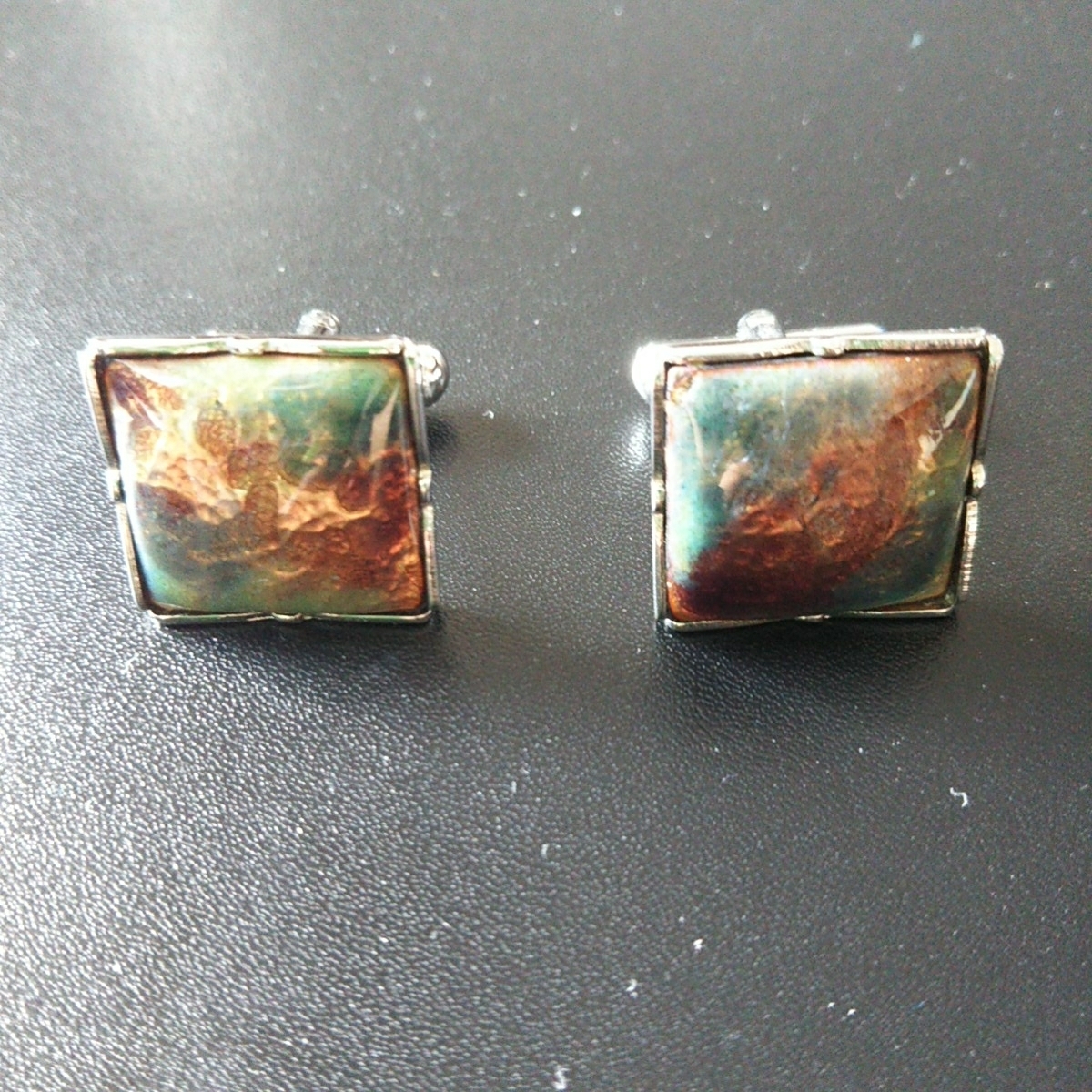 - カフス 七宝 光沢 ニュアンスカラー 正方形 緑 茶色 シルバー 未使用品