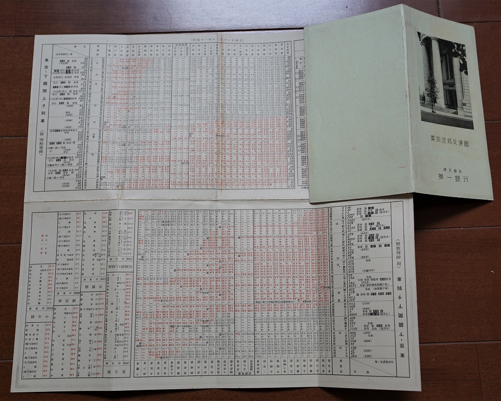 - 東京近郊交通図 株式会社第一銀行 昭和11年 裂けあり :関東首都圏鉄道路線図・東京下関間上り下り時刻表