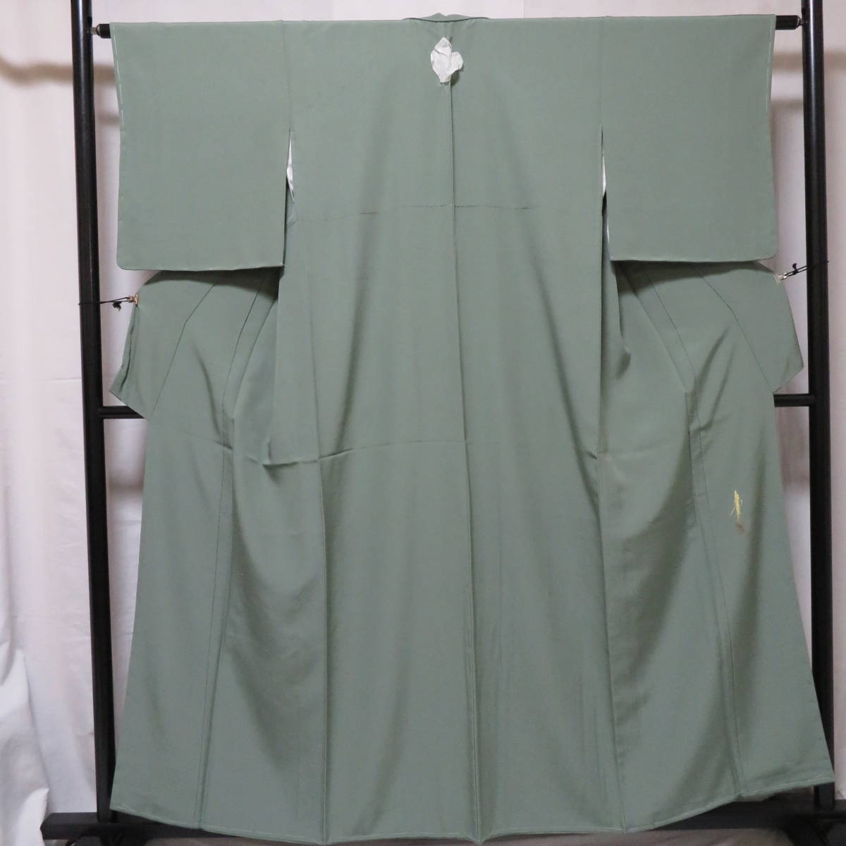 - 【桐輪】色無地.着物*灰緑色☆送料無料*未使用品*仕付け糸付{正絹*色無地*紋付*着物}*身丈160-裄64*丸に三つ蝶.紋*灰緑色地*№3241620