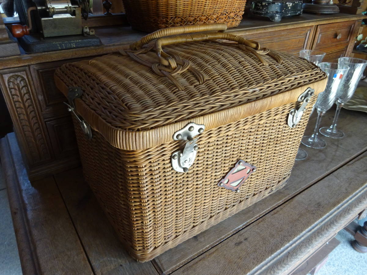 - 【ピクニックバスケット】ワイヤーレザー本革真鍮鋲籠パニエ弁当花見古道具アンティークシャビー昭和レトロインテリア