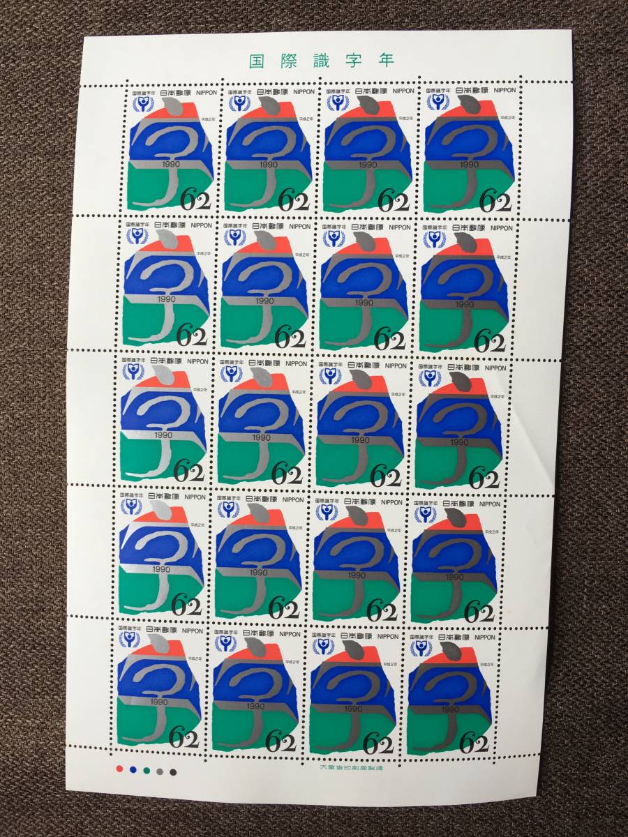 > ★未使用 国際識字年「字」の文字にロゼッタストーンの輪郭 1990年平成2年 シート 郵便切手 62円 20枚 記念切手 日本郵便 大蔵省印刷局製造