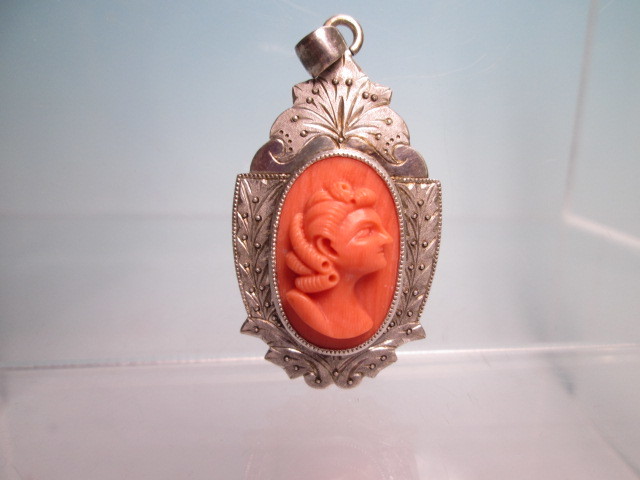 - ☆アンティークジュエリー・彫金細工本珊瑚貴婦人の横顔彫刻のペンダント 9,82g F