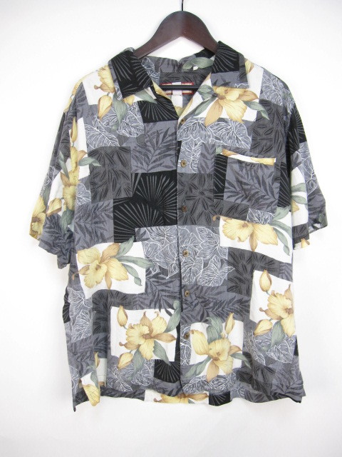 > 大SALE CARIBBEANJOE ヴィンテージ オールド アロハ シャツ オープンカラー フラワー リーフ 柄 黒 L レーヨン C477