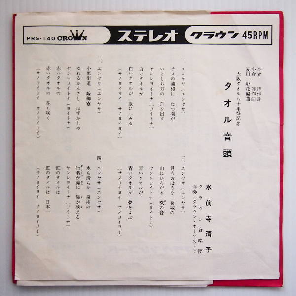 - 送料無料 即決 5999円 EP 7'' PRS-140 PR盤 水前寺清子 タオル音頭 c/w しばらくのお別れね 大阪タオル80年祭記念 音頭 振付 クラウン